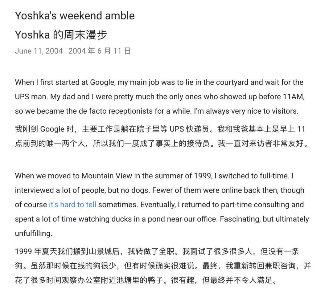 谷歌还会为他们养的第一条狗Yoshka写员工观察日志。(咳咳)