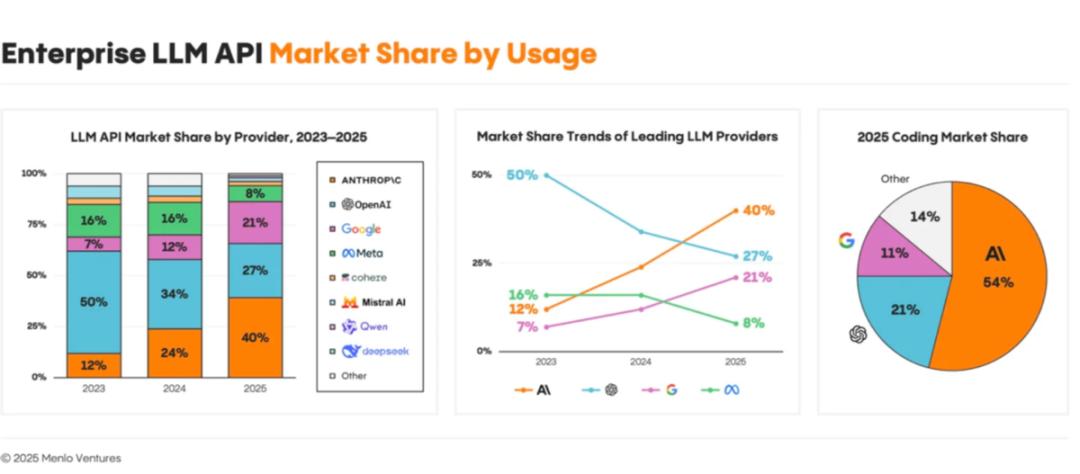 从目前的竞争趋势来看,在大模型的API接口服务上,2025年Anthropic的市占率迅速,已经明显超过了OpenAI。