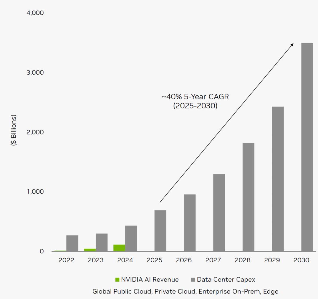 甚至在英伟达的自己对云服务资本开支的预测中,到2030年甚至要拉高到3.5万亿的资本开支水平。其实,就算这个水平上零增长维持五年,那把2.4万亿增量经济价值摊销到五年也没有意义。