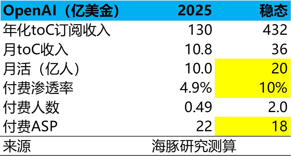 目前ChatGPT 大约8-9亿WAU,估算年化收入120亿美金;如果按照最终20亿MAU(大约油管的用户体量),按目前APP的付费订阅率10%来毛估算,ChatGPT稳态订阅收入可能会在450亿美金上下。