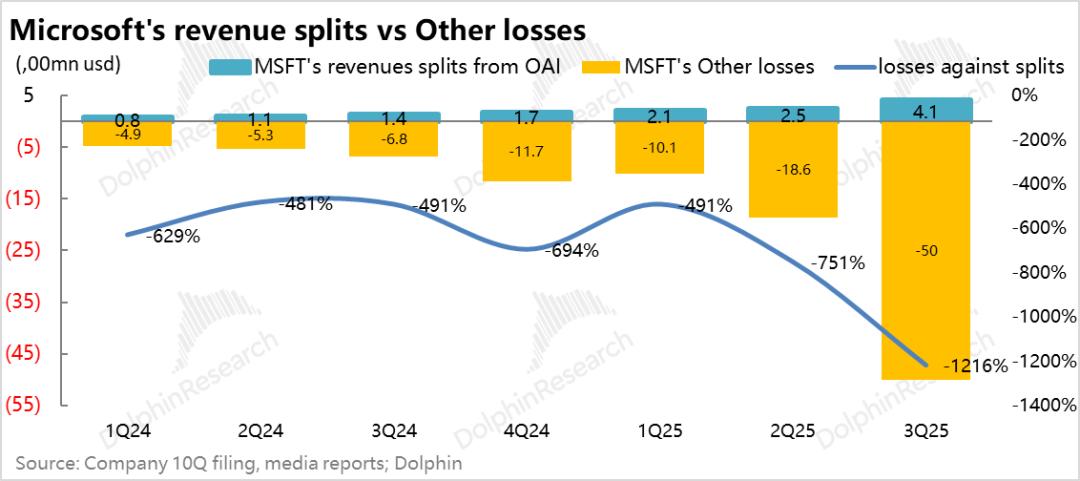 下图是海豚君从媒体报道中整理的微软从OpenAI的收入中拿到提升,假如该提成相对其收入规模比例关系保持稳定,同时三季度之前微软作为40%的股权拥有方,在OpenAI之前的亏损比例也保持稳定,那么微软因OpenAI亏损计入自己表内的亏损承担,相对比微软从OpenAI处获得的收入,能够一定程度上体现OpenAI的亏损率趋势。