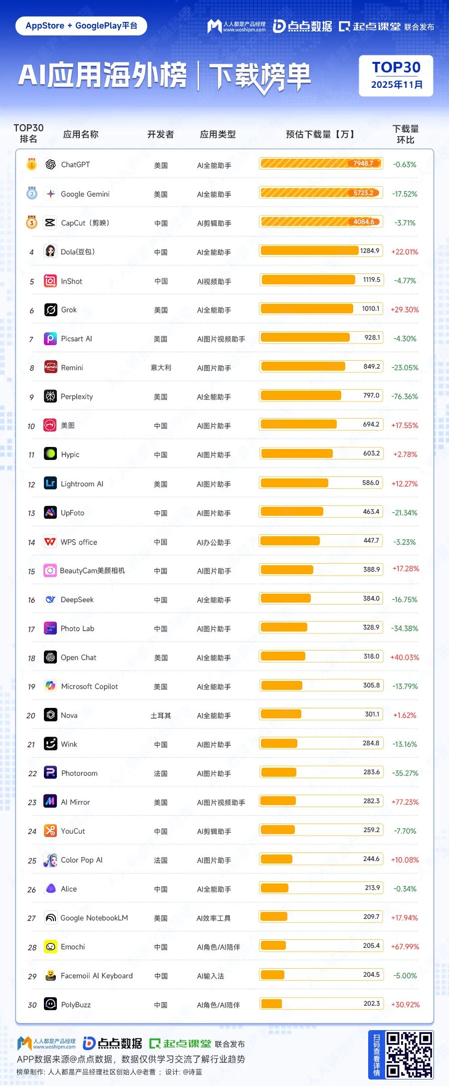 本次榜单的数据主要提取的是两类AI APP,一类是AI原生APP;另一类是深度AI化的传统APP,所以大家会看到很多传统APP上榜就是这个缘由了。过去很多AI博主都鼓吹说过“AI会取代传统APP”,但现在看来,基本不可能了,因为传统APP已经在全面加速AI化进程。