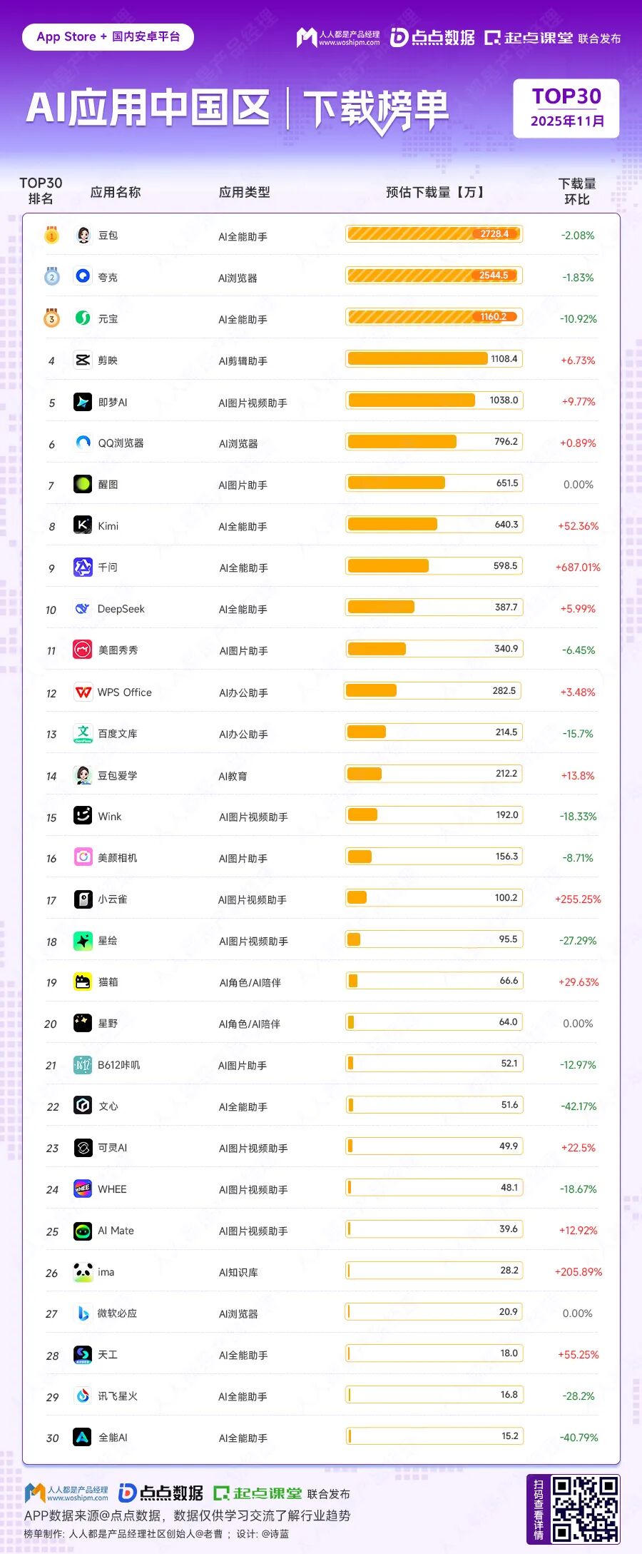 当然,纯血AI应用里,“豆包”确实杀出来了,1.8亿的月活稳坐头把交椅。字节跳动做C端产品的能力,确实是地表最强。你看下载榜就知道,豆包、夸克、元宝、Kimi,这四家现在的下载量咬得非常死。