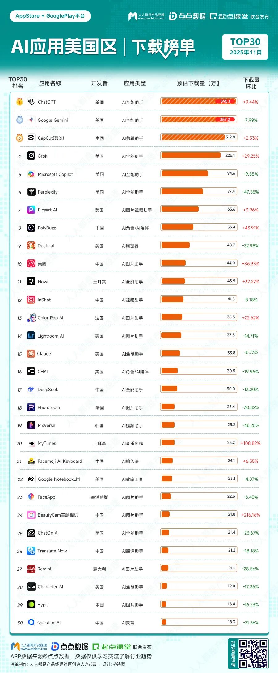 不要以为海外只有ChatGPT。在《美国区下载榜》和《海外活跃榜》上,我看到了大量中国厂商的身影: