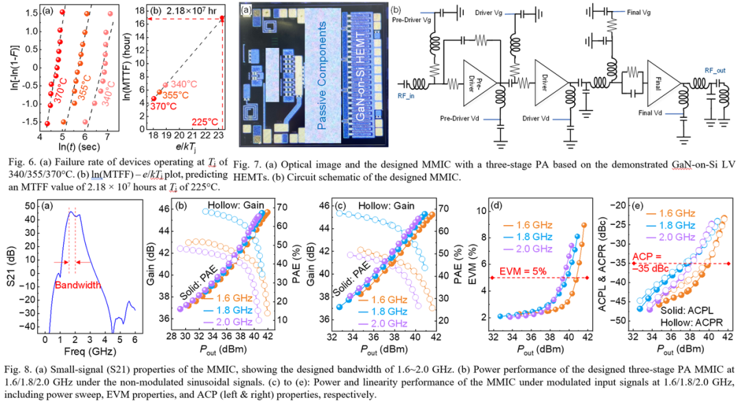 相较于传统的 GaAs 基功率放大器,在保持相当线度性的同时,研究团队开发的低压氮化镓功放展现出显著的性能优势。最终,该器件实现了比上一代更高的功率附加效率(PAE),并同时兼顾通信系统的线性度和功率等级要求,在系统级指标上达成重要突破。