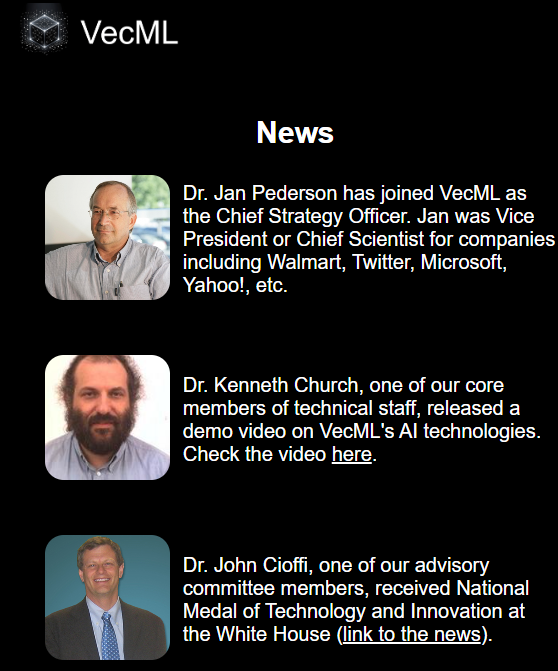值得注意的是,VecML 近期还邀请到了前雅虎和 Ebay 首席科学家、前 Walmart 副总裁,和前微软技术高管 Jan Pedersen 博士,出任 VecML 首席战略官(CSO)。