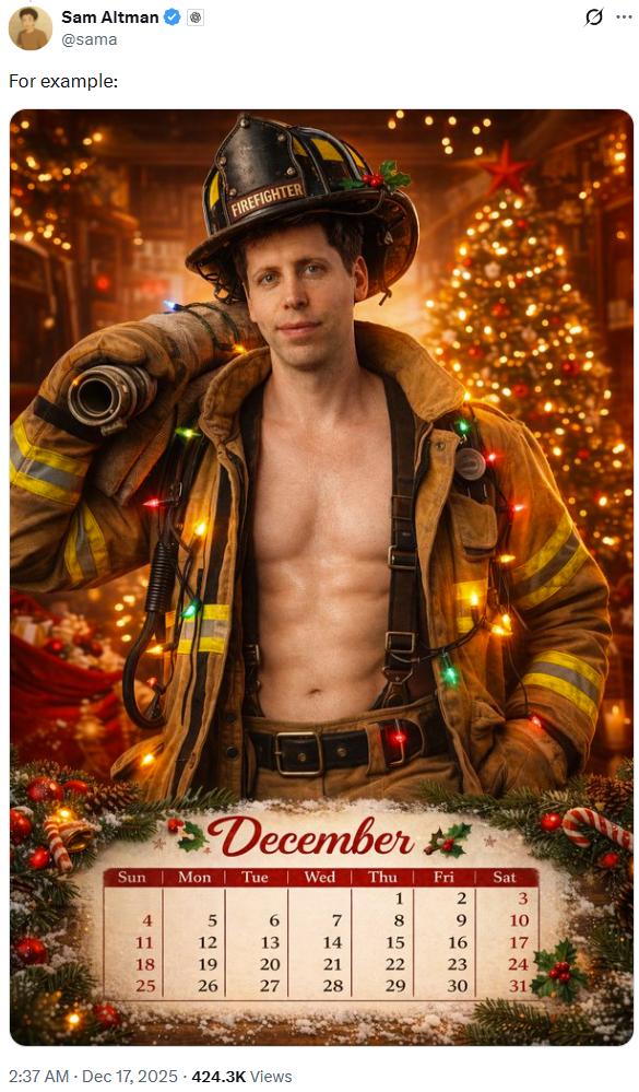 实际上,山姆・奥特曼之所以发这样一张辣眼睛的图片,正是为 OpenAI 刚刚推出的全新ChatGPT Images造势。而且这也不是唯一一张基于奥特曼照片改的图。OpenAI 官方号还专门单独特地发了一张这样的: