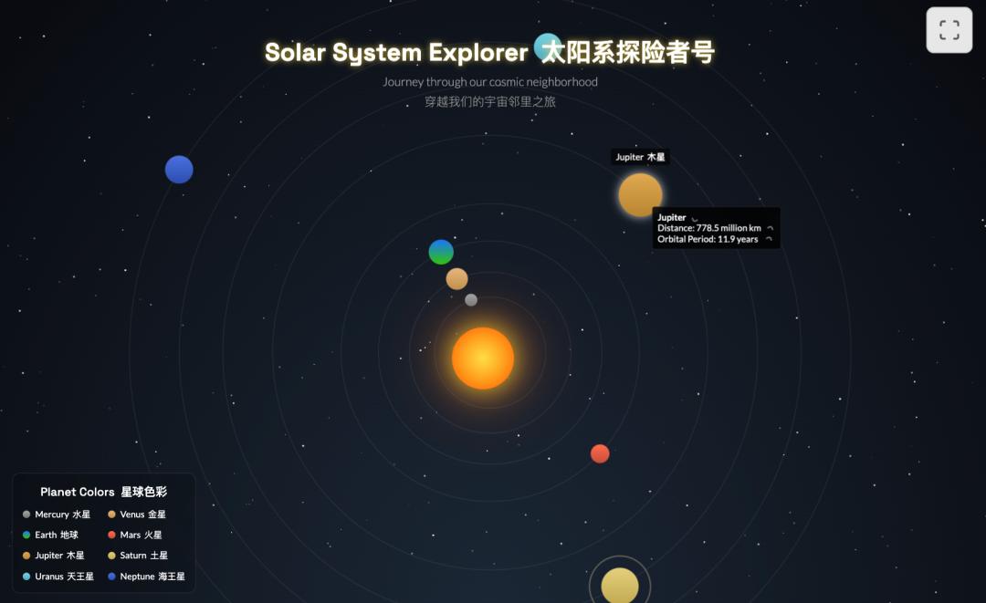 第三个演示是用HTML创建交互式太阳系探测器。当用户点击每个球体就会出现行星的简介。