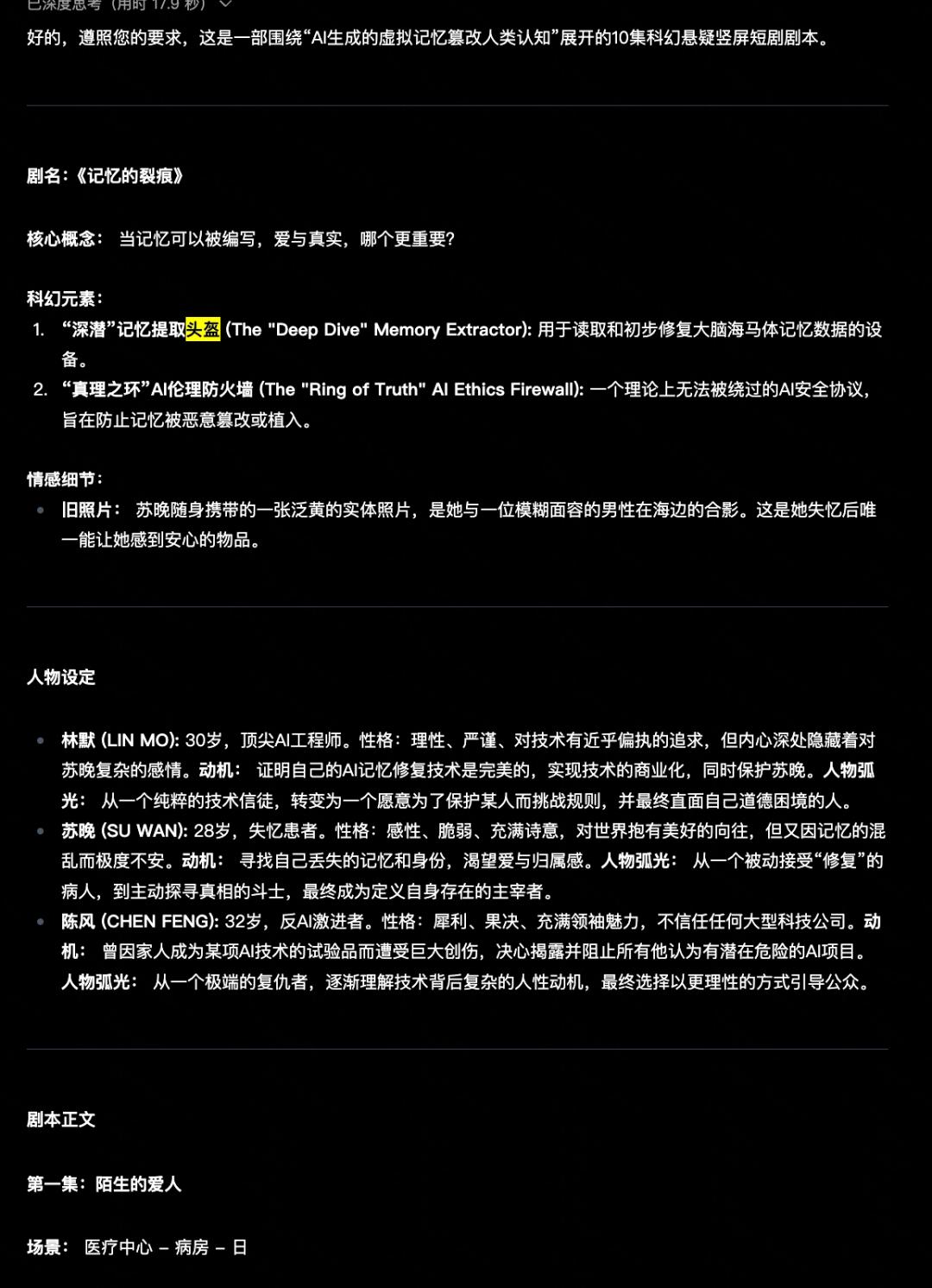 最后智东西让MiMo生成了一部科幻悬疑题材的AI短剧剧本。一上来,MiMo就给出了深潜记忆提取头盔、真理之环AI伦理防火墙两个关键要素,通过检索发现,MiMo在后续剧情中将这两大物体融入进去,直接作为推动剧情发展的关键。