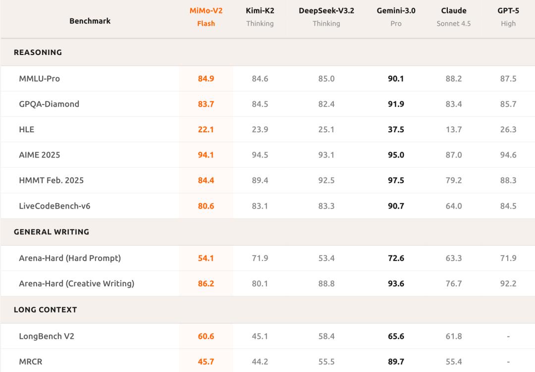 从总的基准测试结果来看,MiMo-V2-Flash在大多数推理基准测试中的性能可与K2 Thinking和DeepSeek V3.2 Thinking相当,同时保持高质量开放式回答的竞争力。