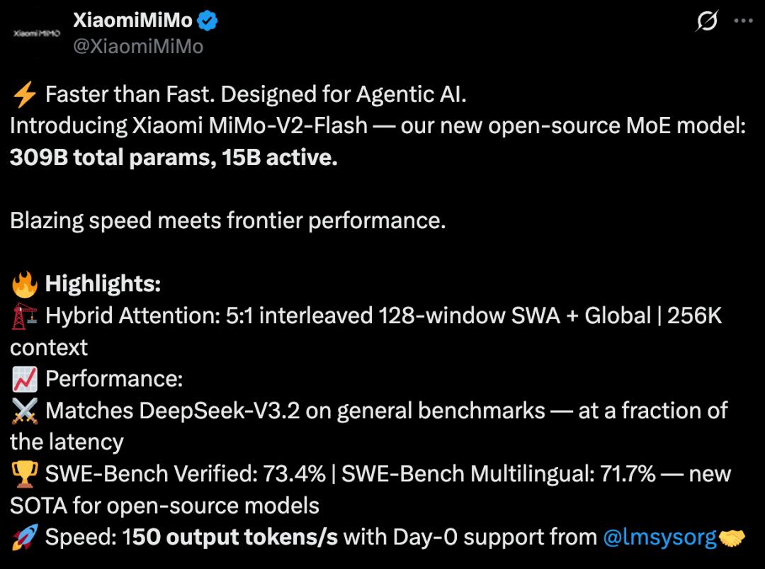 智东西12月17日报道,今天,小米发布并开源了最新MoE大模型MiMo-V2-Flash,总参数309B,激活参数15B。今日上午,小米2025小米人车家全生态合作伙伴大会上,Xiaomi MiMO大模型负责人罗福莉将首秀并发布主题演讲。