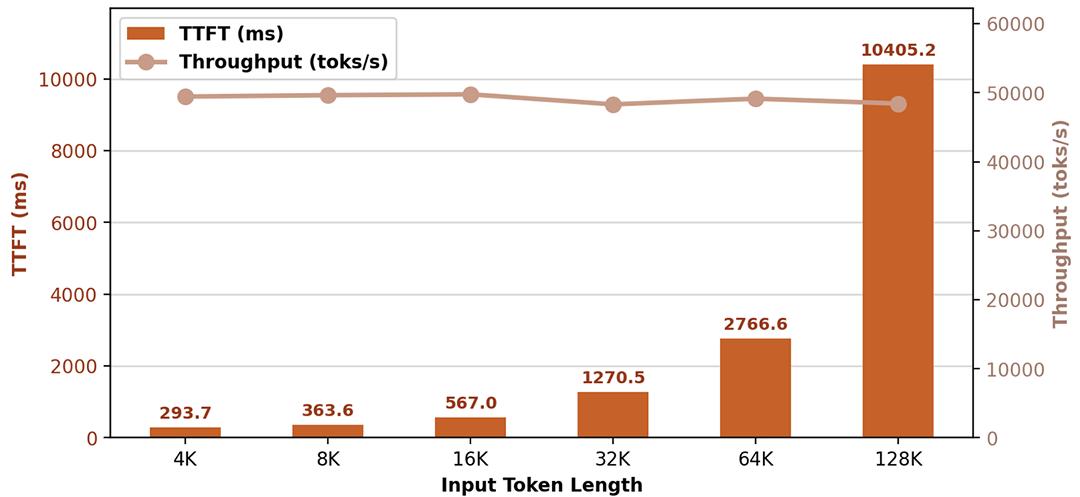 在Prefill单机吞吐约50000 toks/s的条件下,不同Context Length都取得了优越的TTFT性能。
