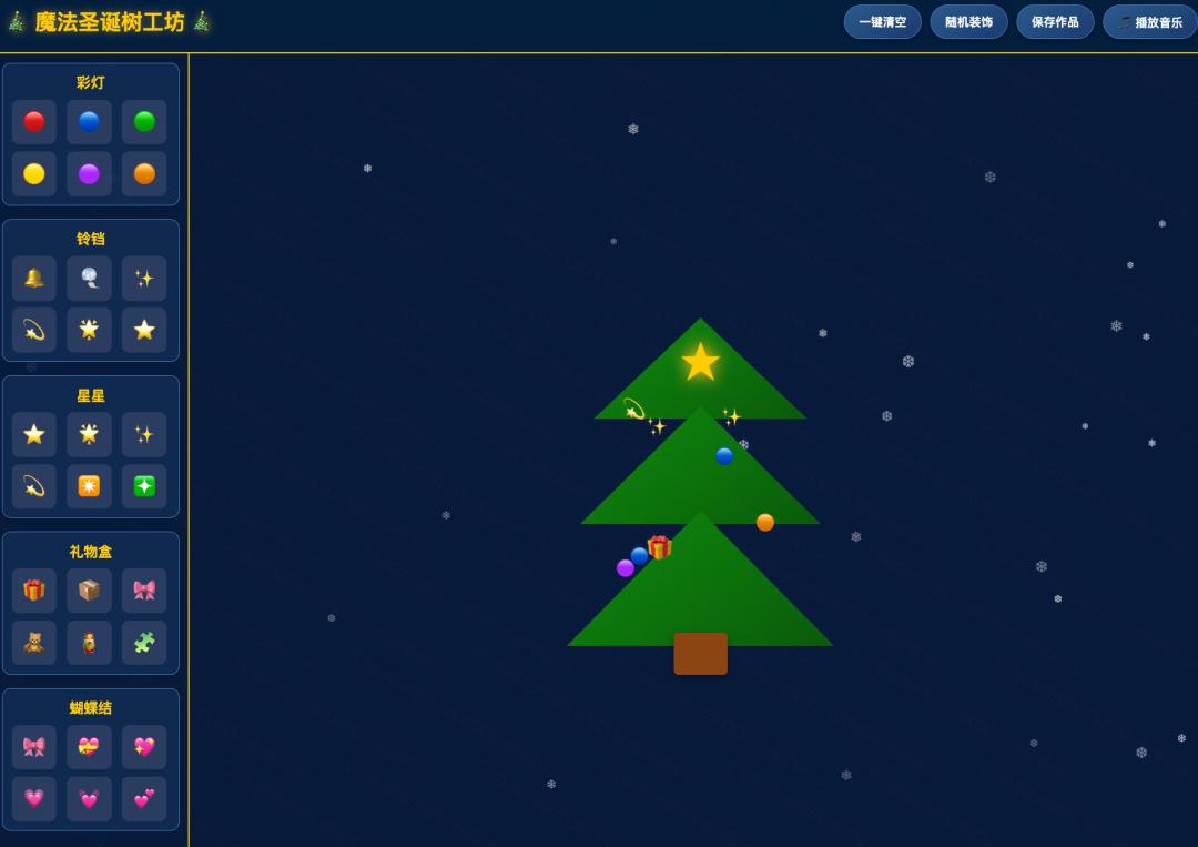 智东西还让其生成了“圣诞树装饰”交互网页。网页左侧有彩灯、铃铛、星星、礼物盒、蝴蝶结,可以拖动这些物品装饰到右侧的圣诞树上,也可以一键清空或者直接生成随机装饰。整个画面会不断飘落雪花,还可以播放背景音乐。