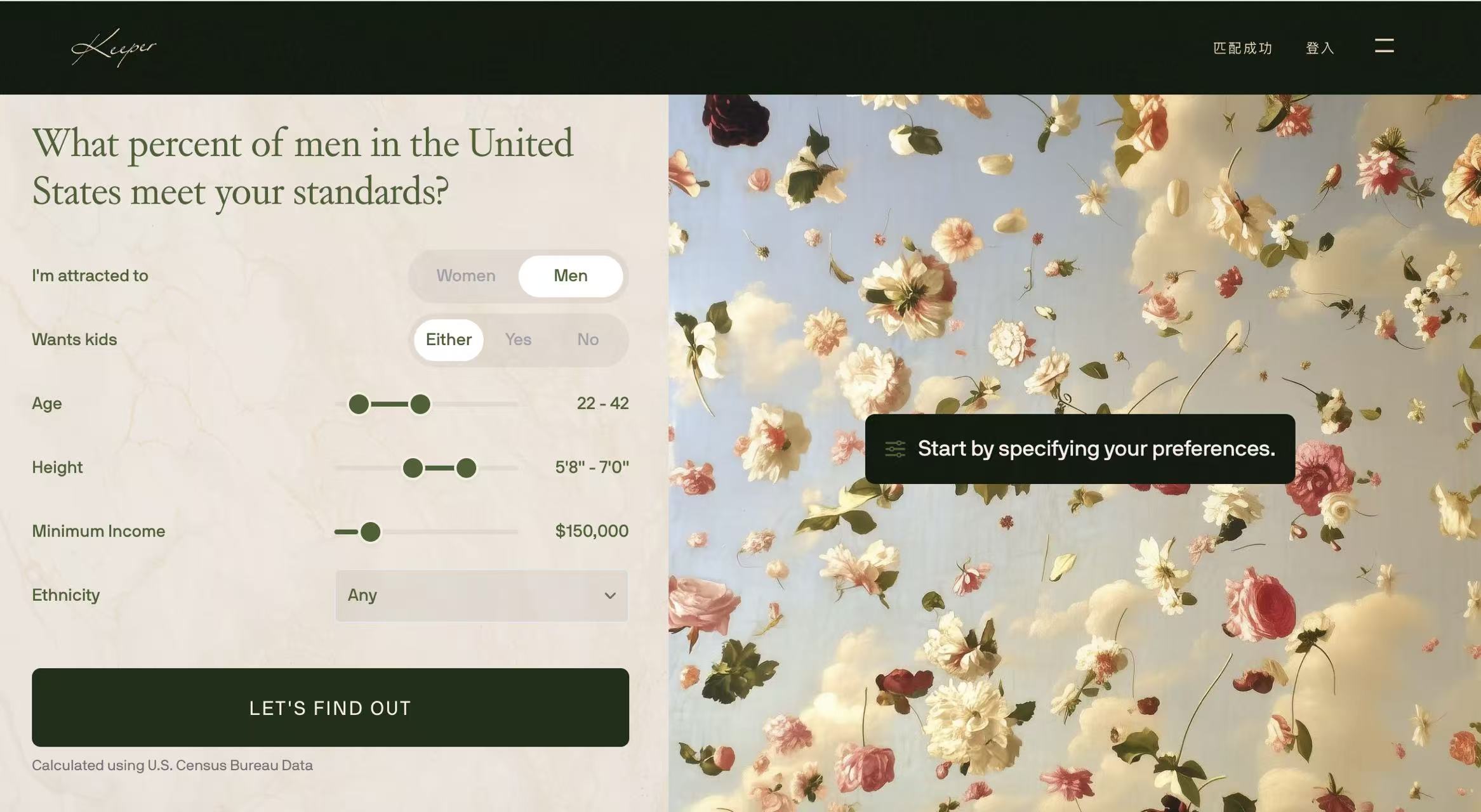 因此,Keeper这个模式就相当于在给自己的AI算法背书,假如它无法给你匹配到伴侣,那么这5万美金的“服务费”,公司也不会收到。这也就能解释,为何短短三年时间,就有30万人选择在该平台建立账户。