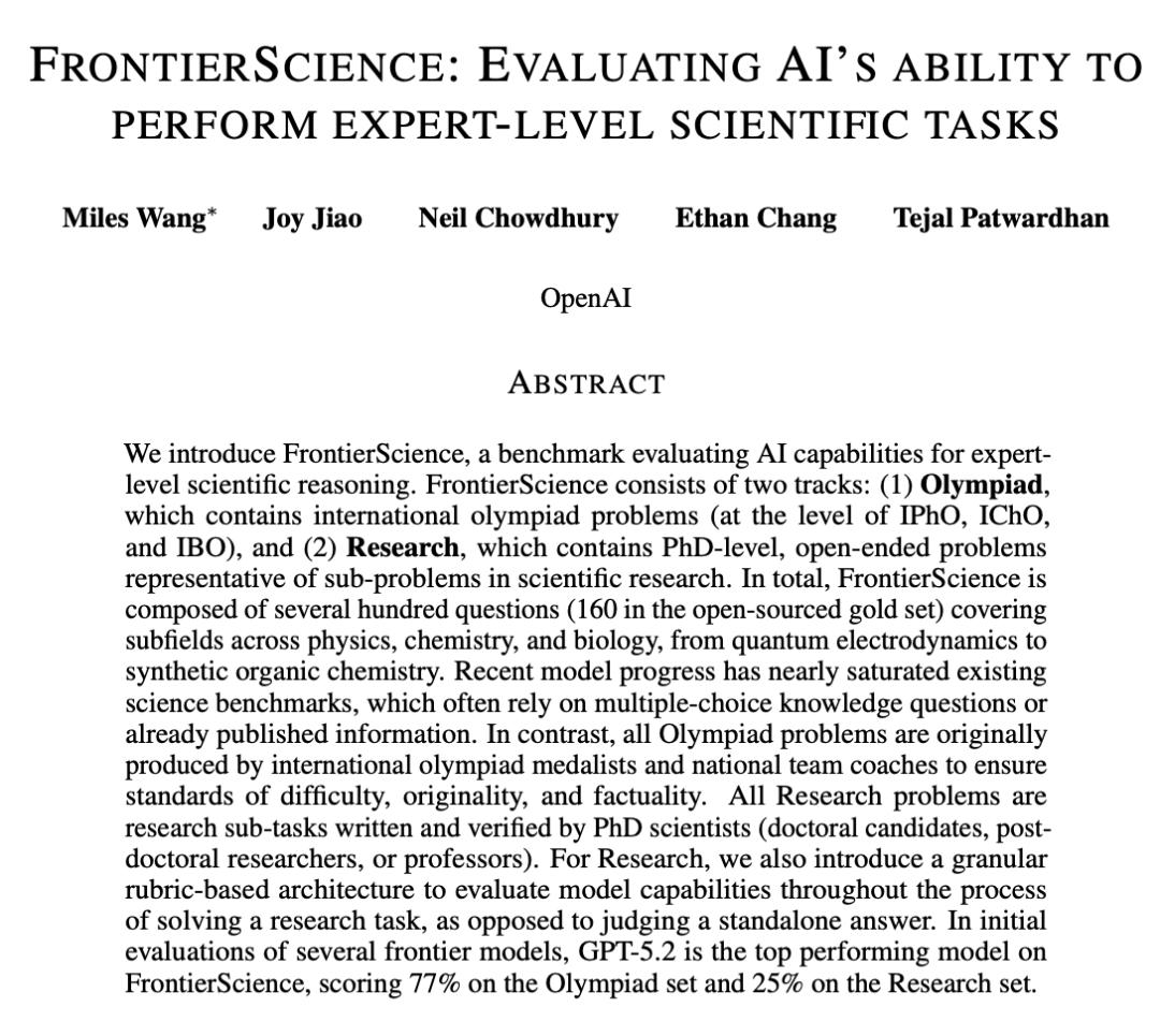 OpenAI最新发布的FrontierScience基准,试图用真实的博士级难题,从物理、化学、生物三个维度上考验AI。真相是残酷的:在没有唯一标准答案的科研实战中,AI作为「顶级做题家」,距离真正的科学家,还差得远。