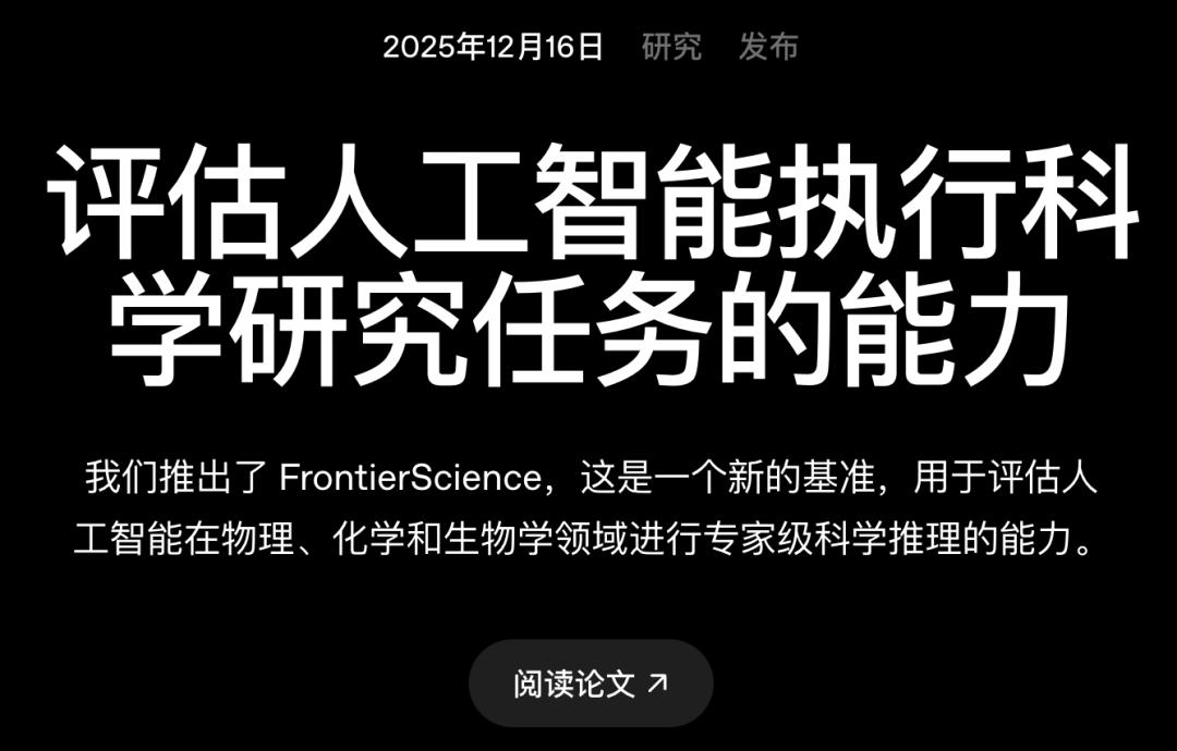 OpenAI在2025年12月16日发布了一套新基准FrontierScience,用来衡量AI在物理、化学、生物三门学科里,能否做到接近专家水准的科学推理,而不只是背知识点。