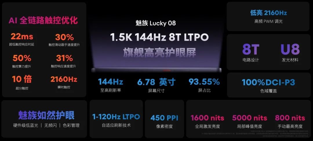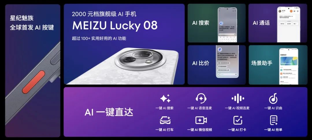 基于Flyme AIOS 操作系统,据介绍,魅族最新发布的Lucky 08 搭载了100多项旗舰级AI 技术,其中包括 AI 搜索、即圈即搜、AI 通话助手、AI 场景助手等。
