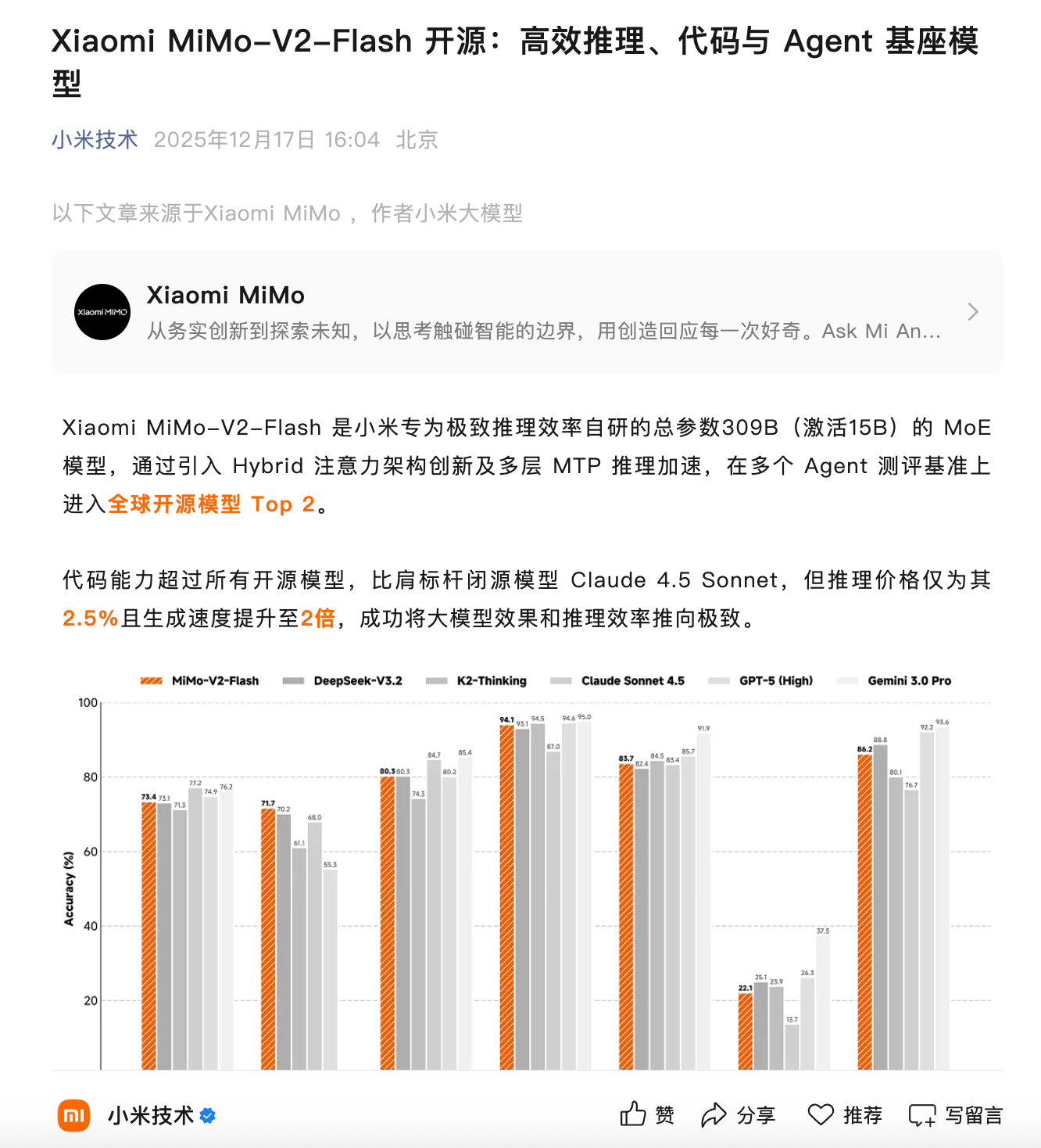 凤凰网科技讯 12月17日,小米官方宣布Xiaomi MiMo-V2-Flash开源。据悉,该模型是小米专为极致推理效率自研的总参数309B(激活15B)的MoE模型,通过引入Hybrid 注意力架构创新及多层MTP推理加速,在多个Agent测评基准上进入全球开源模型Top2。代码能力比肩标杆闭源模型Claude 4.5 Sonnet,但推理价格仅为其2.5%且生成速度提升至2倍。