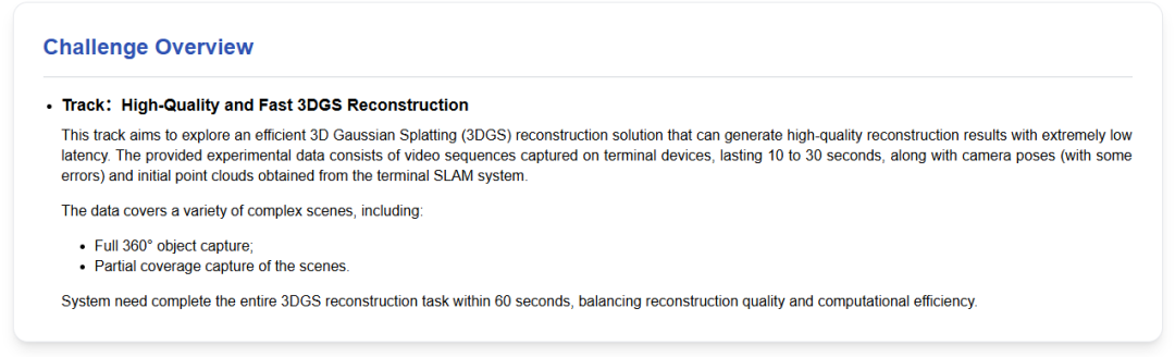 参赛者需在60秒内,基于主办方提供的真实终端视频序列(10–30秒)、存在误差的相机轨迹以及终端SLAM点云,在极短时间内完成完整的3DGS高质量重建。