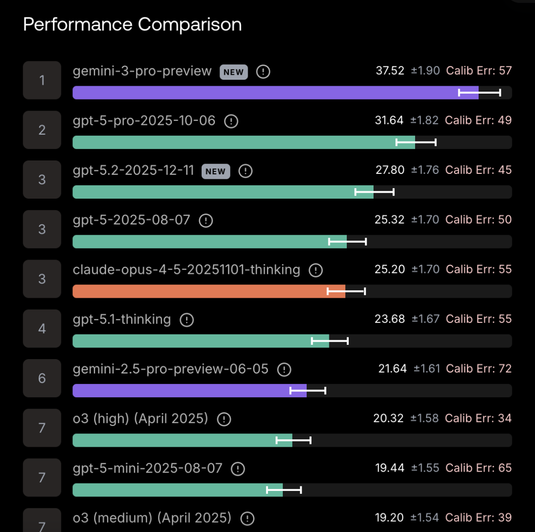 具体而言,Gemini 3 Pro 在不使用任何工具的情况下获得了 33.7% 的分数,Gemini 3 Pro 的得分为 37.5%,Gemini 2.5 Flash 的得分为 11%,而最新发布的 GPT-5.2 的得分为 34.5%。