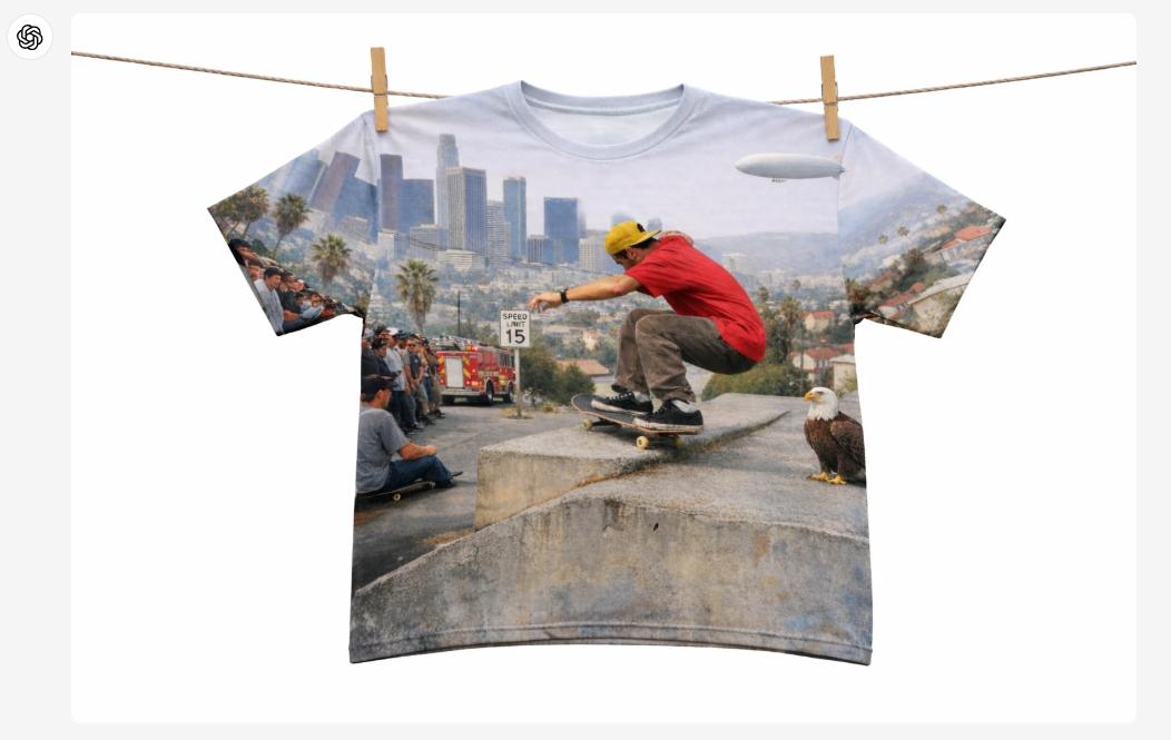 →将那件T恤给穿到滑板手身上。