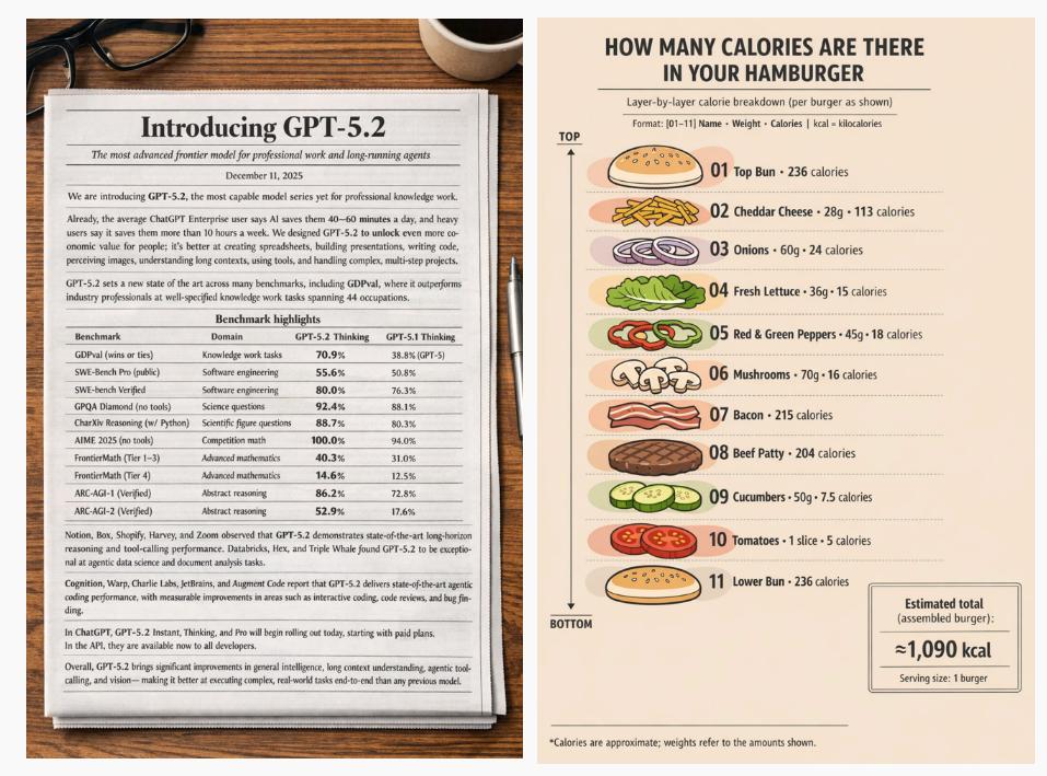 另外,ChatGPT也向谷歌的传统优势项目——生成富含文字信息的示意图,发起了挑战。OpenAI表示,该模型在文本呈现上更进一步,能够处理更密集、更小的文字。