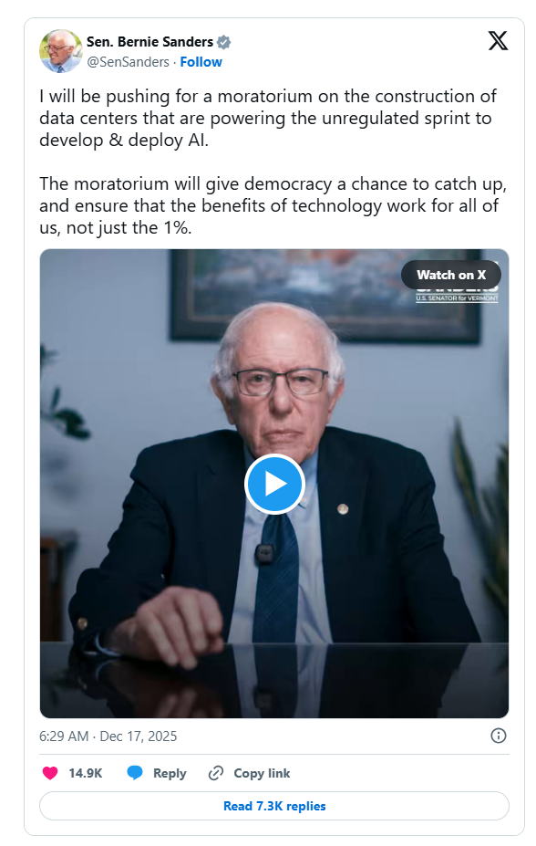 “我们需要全体民众,所有人来参与决定人工智能的未来,而不仅仅是少数亿万富翁,这就是为什么。首先,我将推动暂停数据中心的建设,这些数据中心正为这场不受监管的人工智能开发和部署狂潮提供动力。这项暂停令将使民主有机会迎头赶上。”