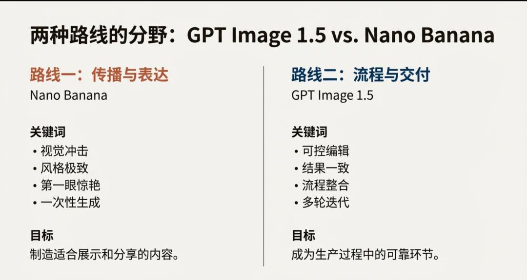 从这个角度看,GPT Image 1.5 与 Nano Banana 并非简单的竞争关系,而是代表了 AI 图像生成的两种方向:一种偏向传播和表达,一种偏向流程和交付。