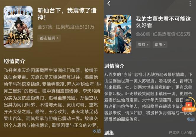 “红果漫剧榜”近期热播前二分别是《斩仙台下,我震惊了诸神!》与《我的古董夫君不可能这么好看》,两部作品相当具有代表性,前者是典型的男频题材,后者则是典型的女频题材。