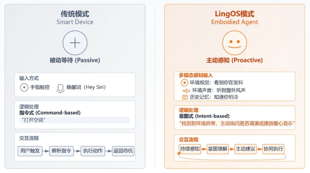 如果说数据是燃料,那么LingOS就是燃烧室。传统的消费电子OS(如Android/iOS)本质上是APP的容器,遵循“人找服务”的逻辑(用户点击图标->启动应用)。而灵宇宙试图定义的LingOS,则是一个“World as Interface”(世界即交互)的代理系统。