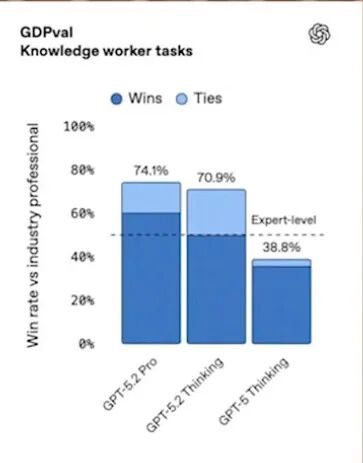 所以,这是一个衡量 AI 在知识工作任务中表现的指标。我就去翻了 GPT 5.2 的发布,去看你们最近放出来的那张 GDP-val 图。当然,这是 OpenAI 自己做的评测。即便如此:GPT-5 thinking(也就是夏天发布的那个 thinking 模型),在知识工作任务中,以 38% 的比例“赢过 / 打平 / 接近人类知识工作者”(大概是 38.8%);而 GPT 5.2 thinking 在知识工作任务上,以 70.9% 的比例赢过或打平;GPT 5.2 pro 则达到 74.1%。并且它还跨过了“专家级”的阈值——看起来它能处理大约 60% 的专家级任务,也就是在知识工作上与专家差不多的水平。这些模型能做这么多知识工作的含义是什么?