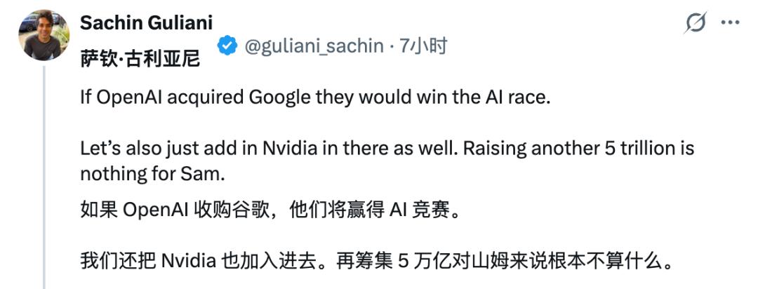 到处筹钱的 OpenAI,看起来更像是在和时间赛跑。于是便诞生了那个笑话:照奥特曼的融资能力,没准哪天连 Google 和英伟达都能「打包带走」。