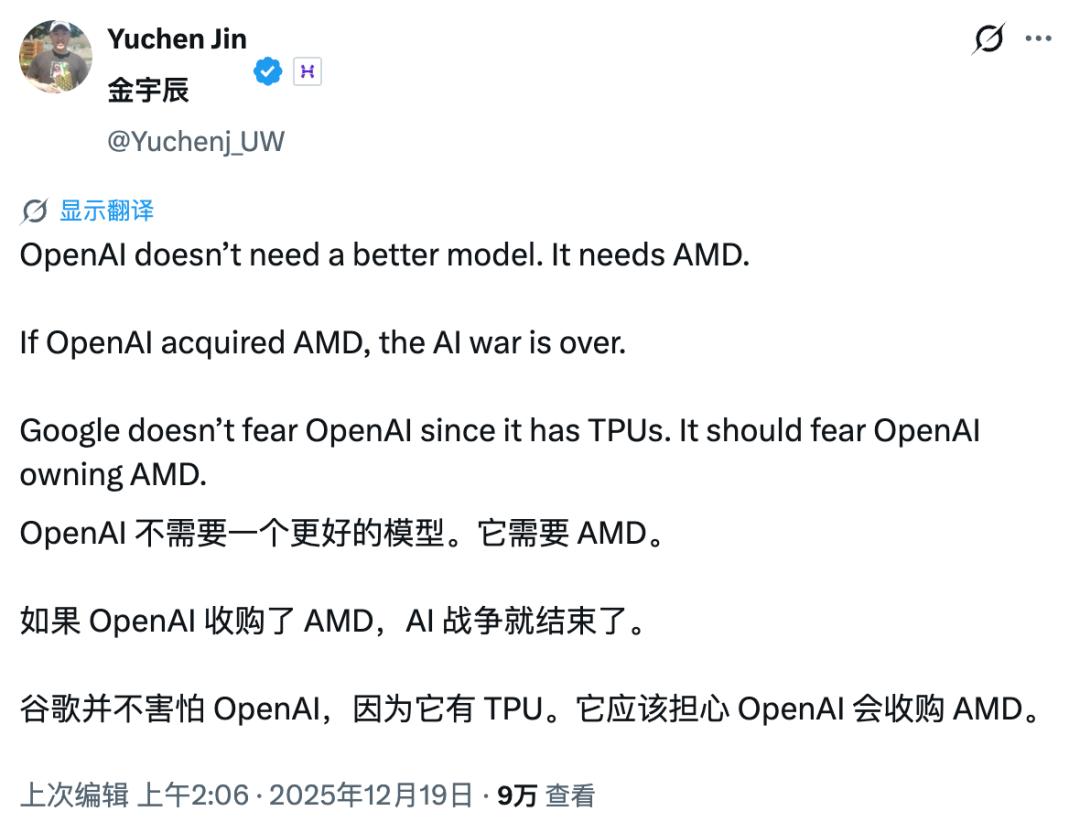 OpenAI 现在并不需要一个更强大的模型,它需要的是 AMD。如果 OpenAI 收购了 AMD,这场 AI 之战就将宣告结束。Google 之所以不怕 OpenAI,是因为它拥有自家的 TPU。但它真正该担心的,是 OpenAI 拥有 AMD。