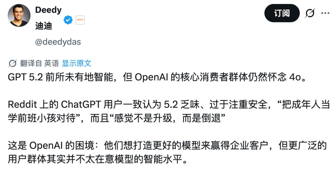在 X 和 Reddit 上,愤怒与失望几乎写在每一条评论里。人们又一次怀念起那个曾经的「白月光」GPT-4o:有人说 GPT-5.2 变得平淡、乏味、像被磨平了棱角;也有人讥讽它成了「把成年人当幼儿园小孩对待」的说教。