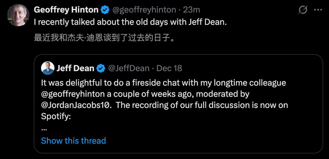 AI教父Hinton和DeepMind首席科学家Jeff Dean,两位AI圈关键人物,曾经合作多年的老友聚在一起。