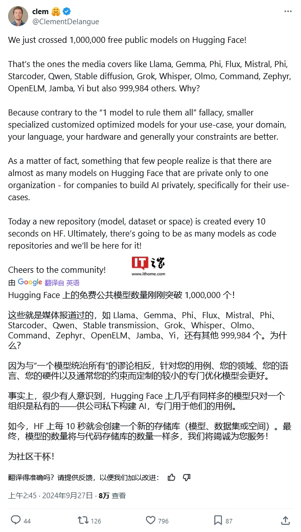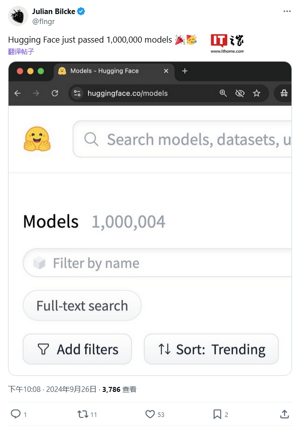 IT之家 9 月 27 日消息,AI 托管平台 Hugging Face 于本周四宣布,该平台收录的 AI 模型数量突破 100 万个,是 AI 领域快速发展的一个重要缩影。