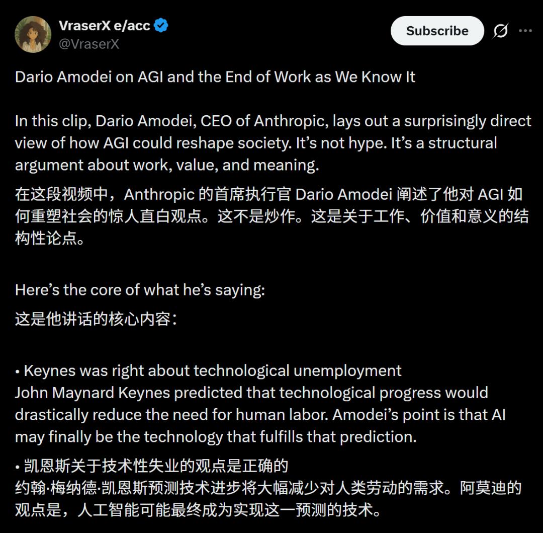 Anthropic CEO Dario Amodei也说,凯恩斯关于技术性失业的观点是正确的。