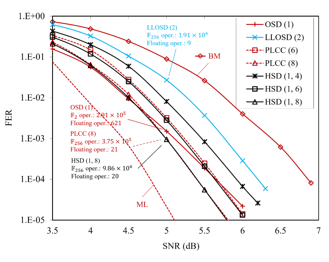 图1展示了HSD译码的流程图,值得指出的是代数Chase译码和LLOSD译码共享了大量插值计算,为低复杂度译码架设了前提。图2比较了(255, 233) BCH码的OSD、LLOSD、PLCC (progressive low-complexity Chase,渐进低复杂度Chase)和HSD译码性能和复杂度,可以看到HSD译码对处理长度为200比特以上的较高码率BCH码展现出优异的性能(误码率性能更好,复杂度更低)。