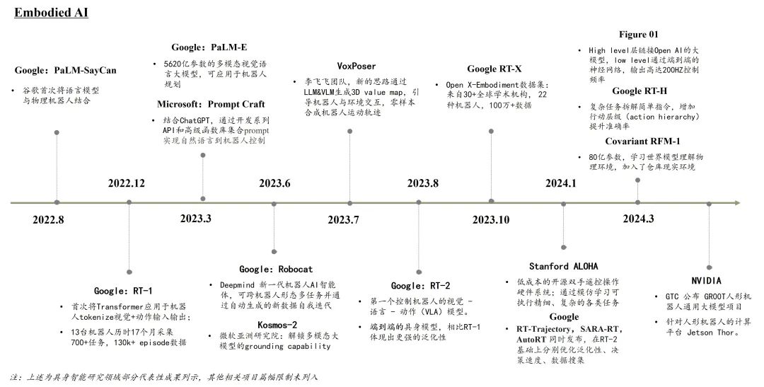 大模型的出现为迈向通用人工智能提供契机。自谷歌Transformer神经网络架构发布以来,众多研究者发现基于Transformer的预训练语言模型在非语言类的任务中也能取得不错的效果,具有较强的泛化能力。此后大模型被引入具身智能领域,例如谷歌在2023年发布的PaLM-E模型,即是基于Transformer神经网络开发的具身多模态大语言模型。