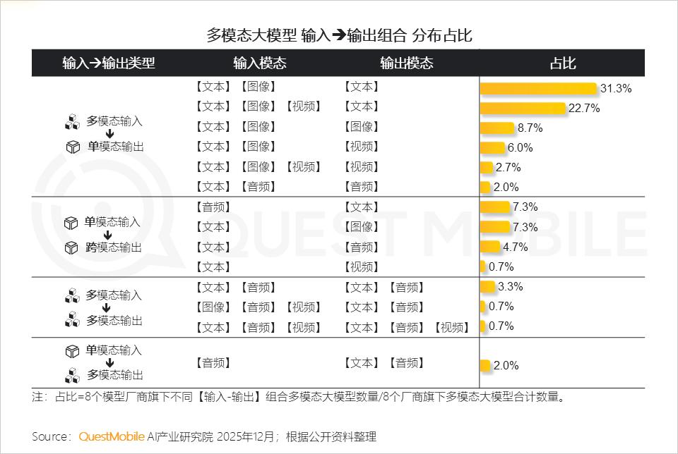 •多模态下【多模态输入>单模态输出】组合占比最高,达73.3%