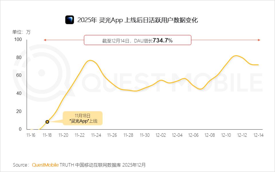 QuestMobile数据显示,截至2025年12月14日,灵光App日活跃用户规模实现7倍增长。