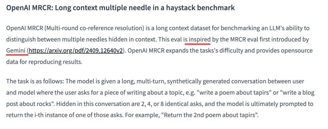 OpenAI受到Gemini的启发,也搞了一个OpenAI-MRCR,就是一开始上面所说的评测基准。
