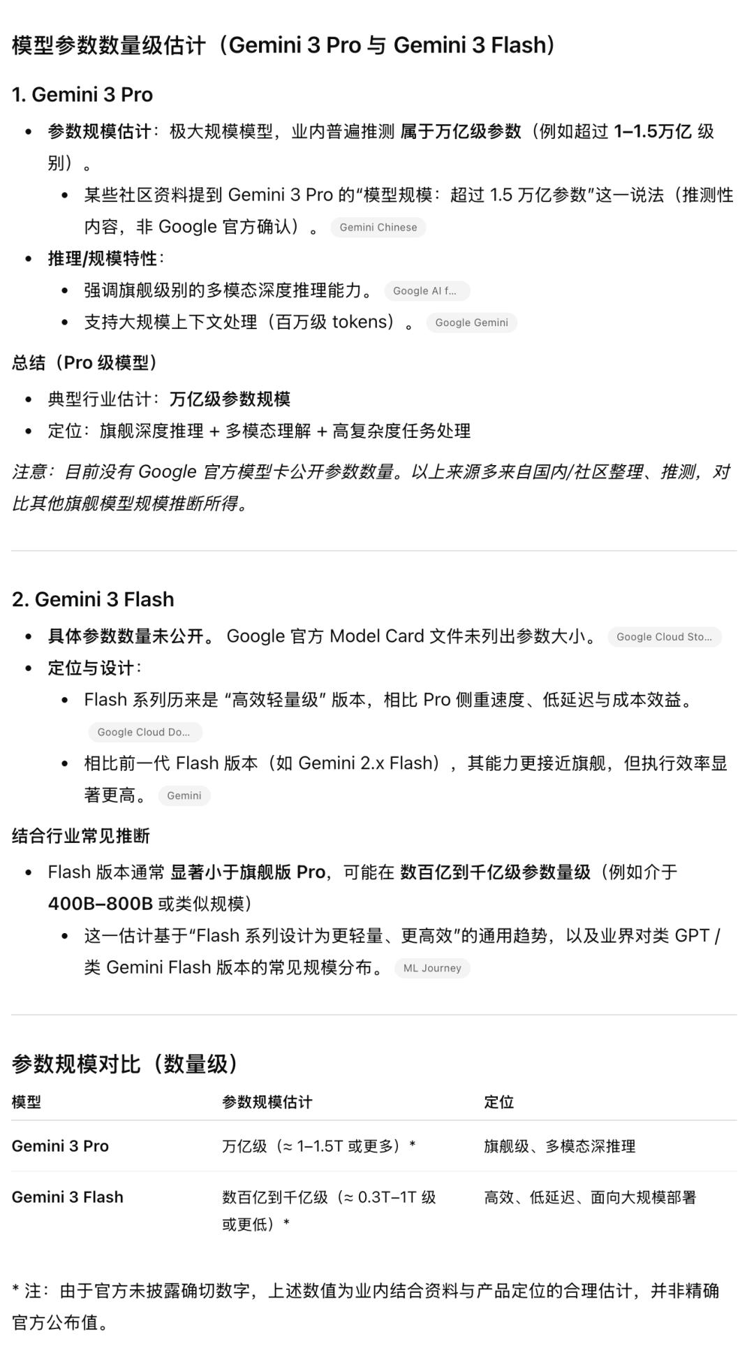 分别向Gemini和GPT询问了Gemini 3 Pro和Flash的参数大小。