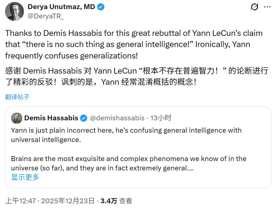 本来大家以为这只是 LeCun 的日常输出,没想到引来了另一位大佬:Google DeepMind 的掌门人 Demis Hassabis。