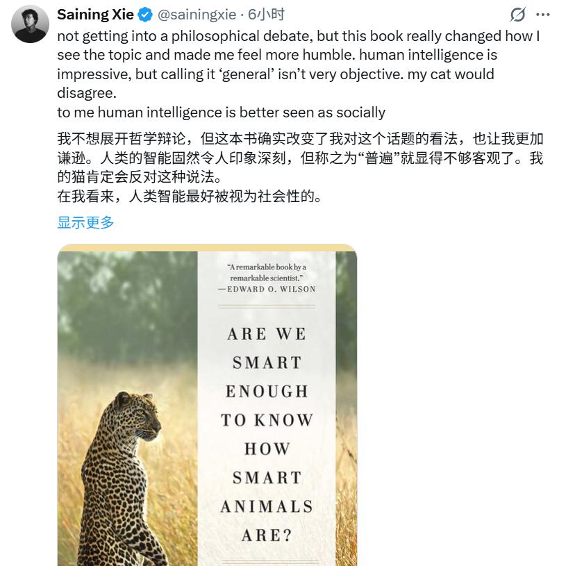 谢赛宁显然是支持 LeCun 的。他推荐了 Frans de Waal 的书《Are We Smart Enough to Know How Smart Animals Are?》(我们足够聪明到知道动物有多聪明吗?),表示这本书彻底改变了他对人类智能和动物智能的看法,让他感到更谦卑。