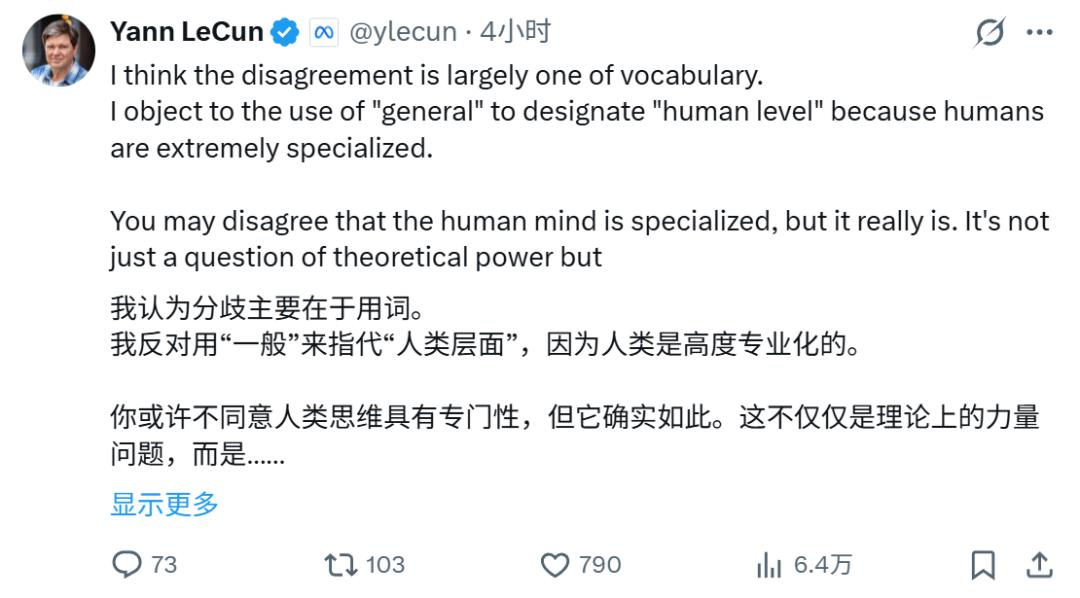 不过,两位大佬的争论看似围绕「定义」,实质上反映的是对 AGI(通用人工智能)发展路径的不同判断。