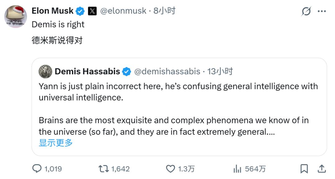 马斯克依旧保持了他的简洁风格,转发并评论:「Demis 说得对。」