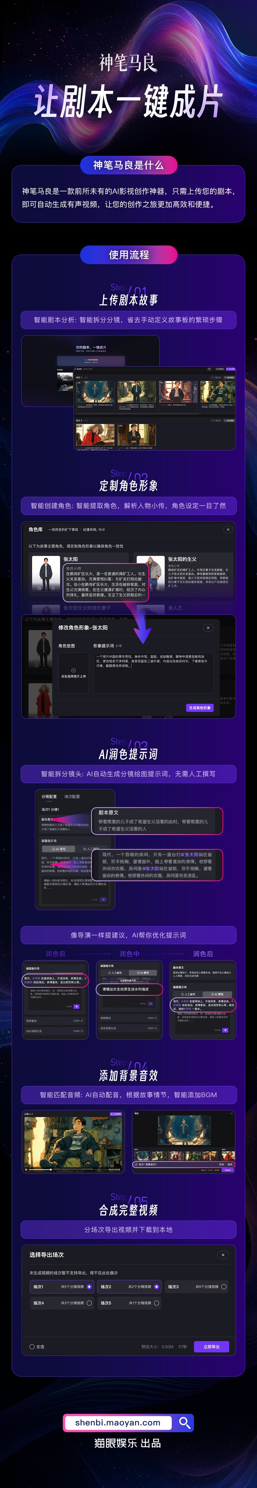 IT之家 9 月 27 日消息,猫眼娱乐今天发布了首个面向长剧本解析的动态故事板 AI 生成工具“神笔马良”,该产品可对用户上传的剧本进行一键智能分析、智能角色创作、智能分镜创作、智能台词朗读,实现剧本内容的视听化呈现。