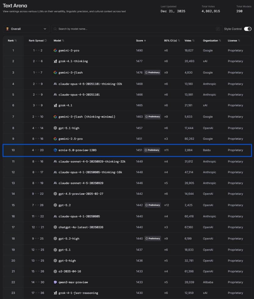今天(12月23日),全球公认最难刷榜、最讲究「盲测体验」的大模型竞技场 LMArena ,更新了排名;在众多美国模型的重重包围里,百度文心 ERNIE-5.0-Preview-1203 杀了出来,以 1451 分拿下了国内第一。