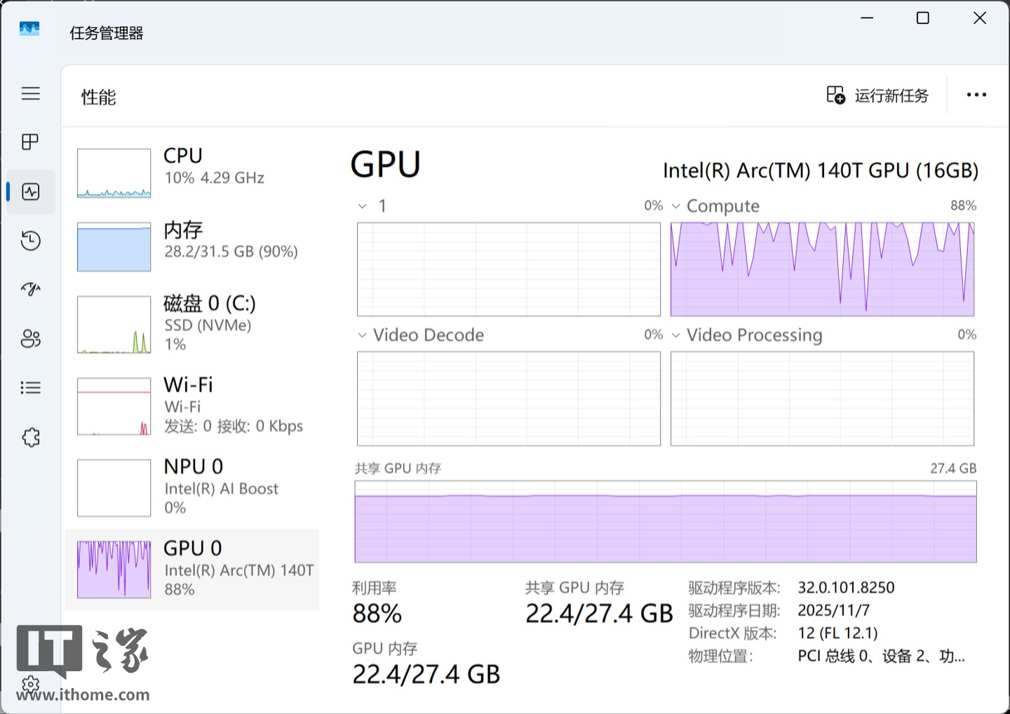 27.3GB 的可用显存容量,实际上已经超越了许多桌面级旗舰显卡。虽然 DDR5 内存的带宽无法与 GDDR6X 相比,但在模型加载和运行大规模权重的场景下,“能不能跑”是 0 和 1 的区别,而英特尔通过内存共享技术解决了“从无到有”的问题。